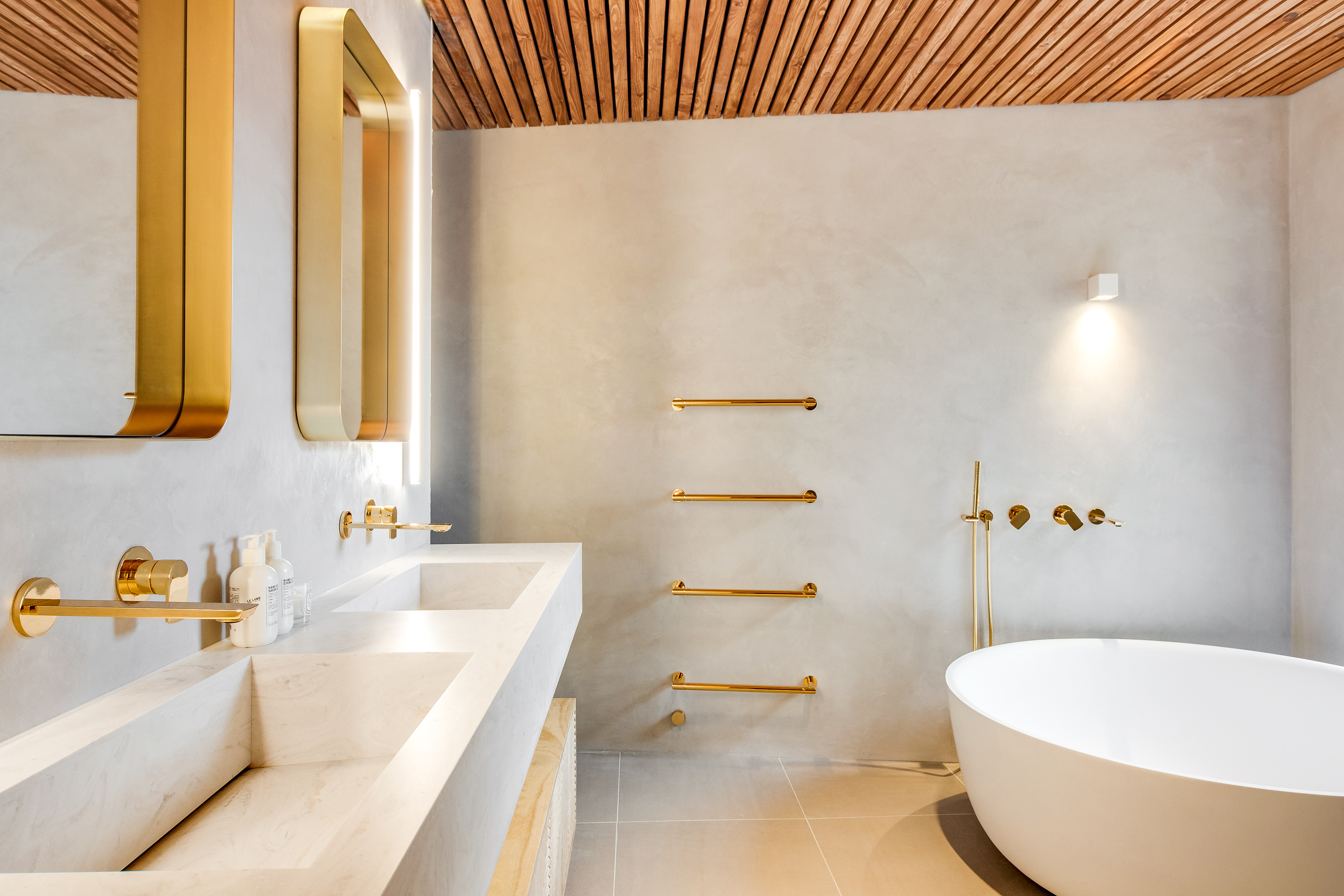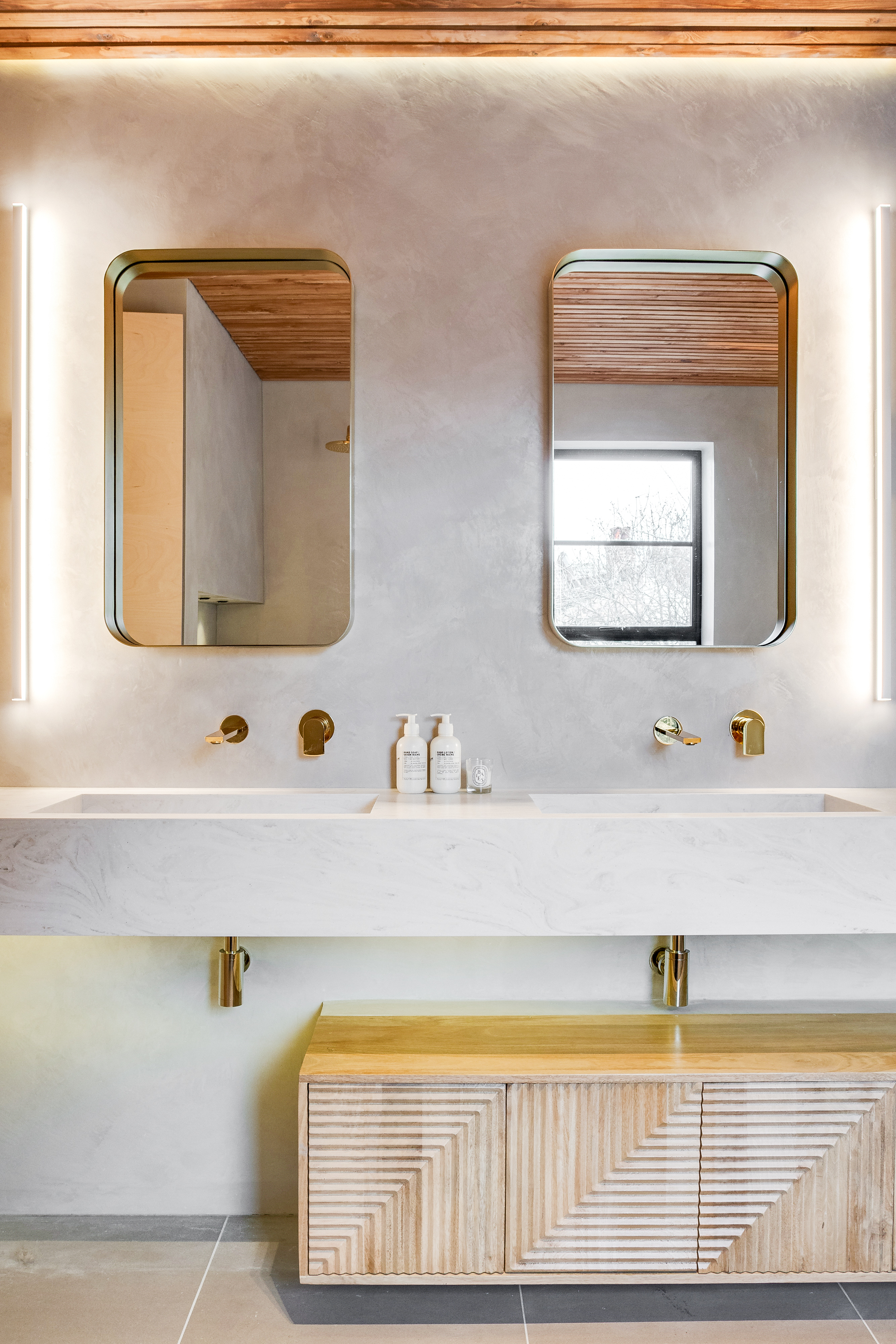 Inside, every detail was considered to harmonise style with everyday functionality. Bespoke joinery was designed for each room, complementing the family's distinctive collection of furniture and accessories while maximising storage and flow. Upstairs, a freestanding bathtub forms the centrepiece of a serene retreat, where soft finishes and natural materials provide a calming, restorative environment.